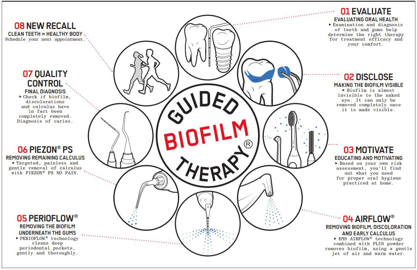 Guided Biofilm Therapy uses new technology quickly and painlessly to remove biofilm, calculus and discolouration. GBT uses Airflow, Perioflow and Piezon: